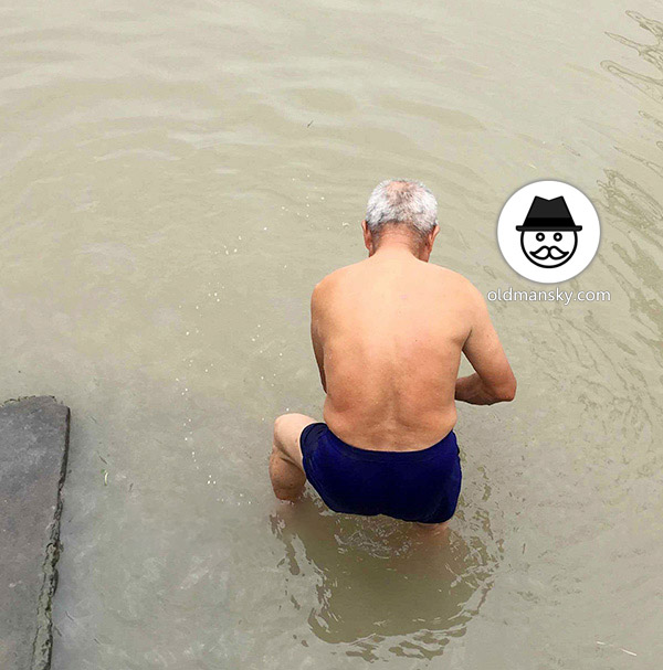 White hair old man wore a brown underwear was washing his head by the river