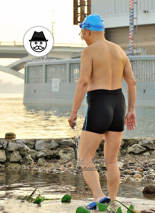 Fat old man wore a blue underwear went swimming